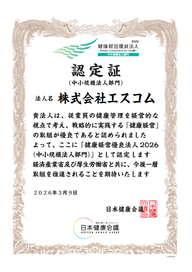 2026年3月9日、健康経営優良法人2026(中小規模法人部門)に認定されました(2021~2026年 6年連続)。
