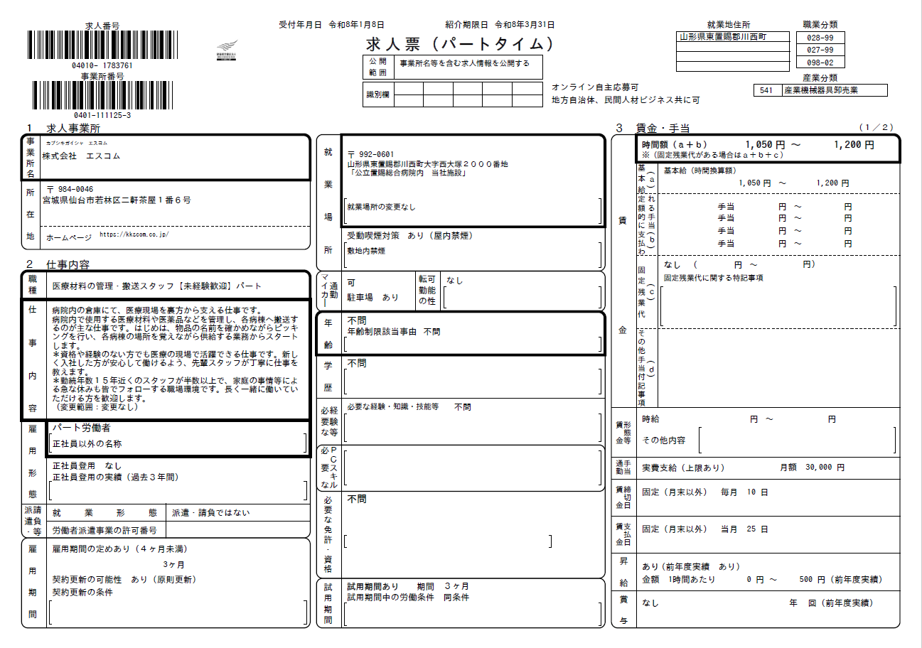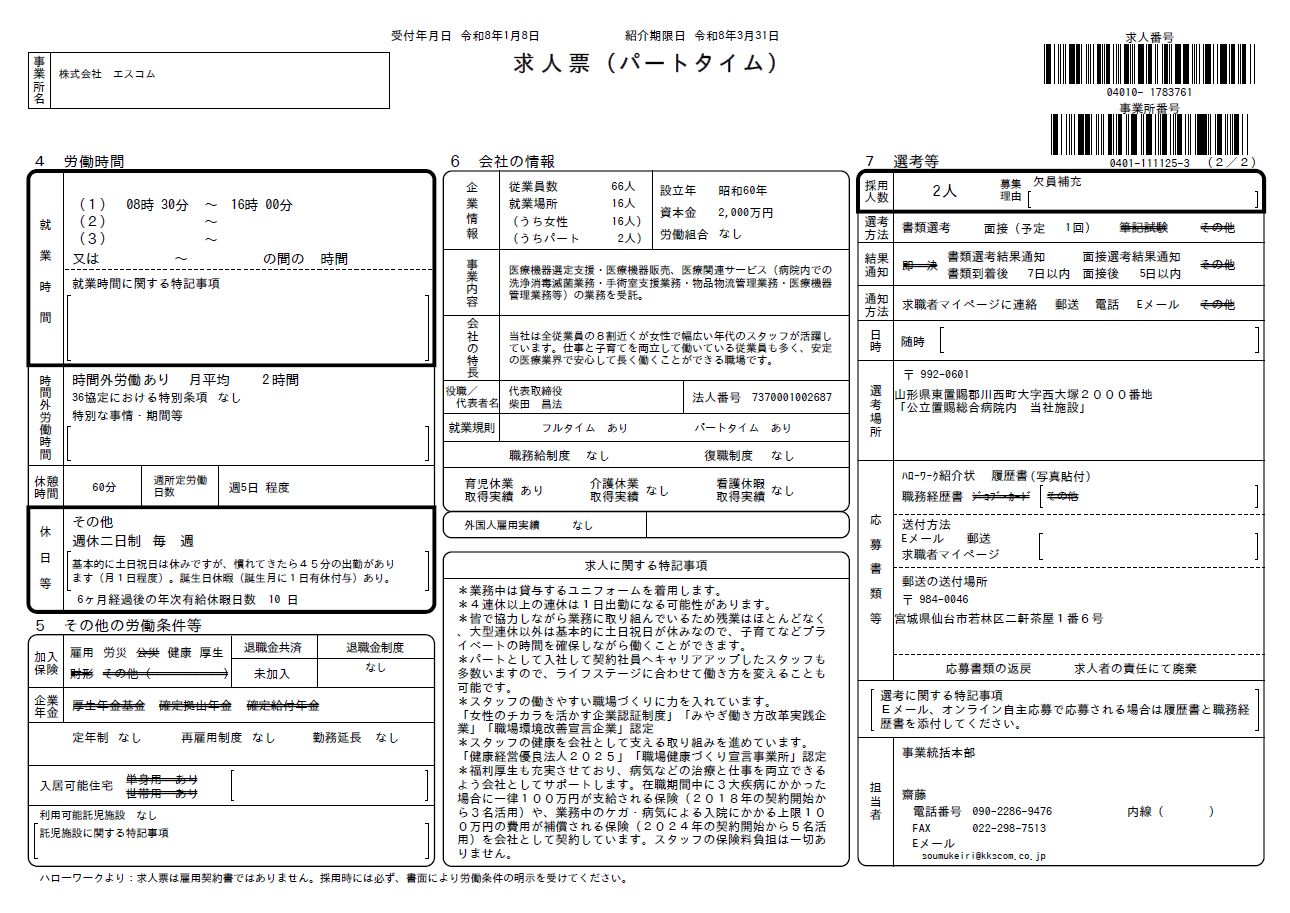 | 詳細 | 病院内の倉庫にて、医療現場を裏方から支える仕事です。 病院内で使用する医療材料や医薬品などを管理し、各病棟へ搬送するのが主な仕事です。はじめは、物品の名前を確かめながらピッキングを行い、各病棟の場所を覚えながら供給する業務からスタートします。 *資格や経験がない方でも医療の現場で活躍できる仕事です。入社後は先輩スタッフが丁寧に仕事を教えます *勤続年数15年近くのスタッフが半数以上で、家庭の事情等による急な休みも皆でサポートしますので長く働きやすい職場です。 *患者様と直接関わることはありません *貸与するユニフォームを着用して作業します *パートとして入社して契約社員へキャリアアップしたスタッフも多数いますので、ライフステージに合わせて働き方を変えることも可能です *福利厚生を充実させており、病気などの治療と仕事を両立できるように会社としてサポートします。在職期間中に3大疾病にかかった場合に一律100万円が支給される保険(2018年契約開始から3名活用)や、業務中のケガ・病気による入院にかかる上限100万円の費用が補償される保険(2024年契約開始から5名活用)を会社として契約しています。スタッフの保険料負担は一切ありません。 *スタッフの働きやすい職場づくりに力を入れています。「女性のチカラを活かす企業認証制度」「みやぎ働き方改革実践企業」「職場環境改善宣言企業」認定 *スタッフの健康を会社として支える取り組みを進めています。「健康経営優良法人2025」「職場健康づくり宣言事業所」認定 |